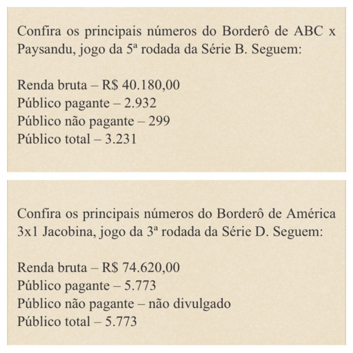 CONFIRA OS NÚMEROS DOS BORDERÔS DE AMÉRICA X JACOBINA E ABC X PAYSANDU!!!