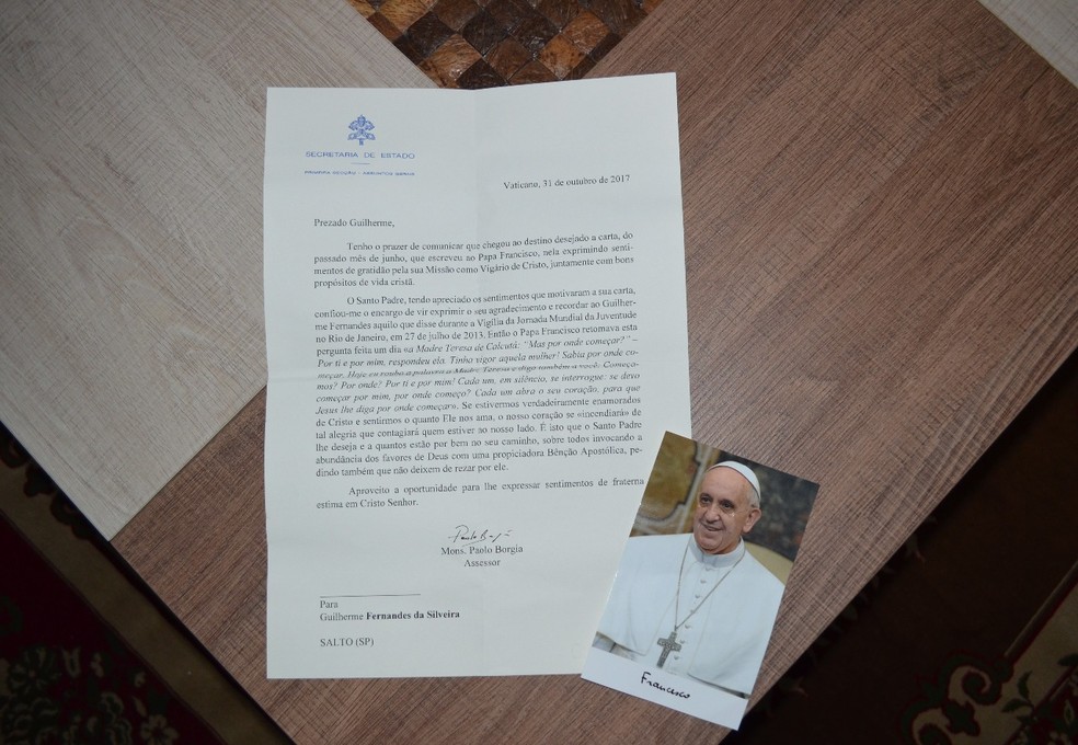Um ex-jogador de futebol, morador de Salto (SP), foi surpreendido ao encontrar entre as correspondências uma carta do Vaticano endereçada a ele. Guilherme Fernandes da Silveira, de 20 anos, escreveu ao Papa Francisco, em junho, contando sobre a busca pela vocação e sua experiência na Jornada Mundial da Juventude, na Polônia.